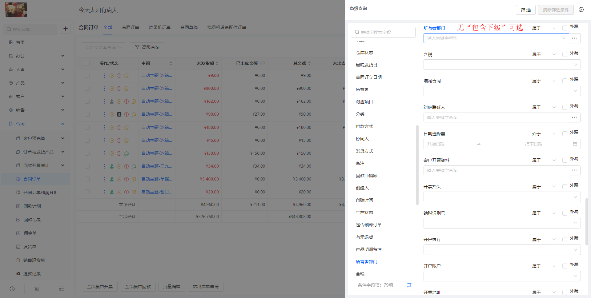 用部门查询数据时候,增加“包含下级”可选勾选,满足用户快速查询部门及下级部门数据情况。