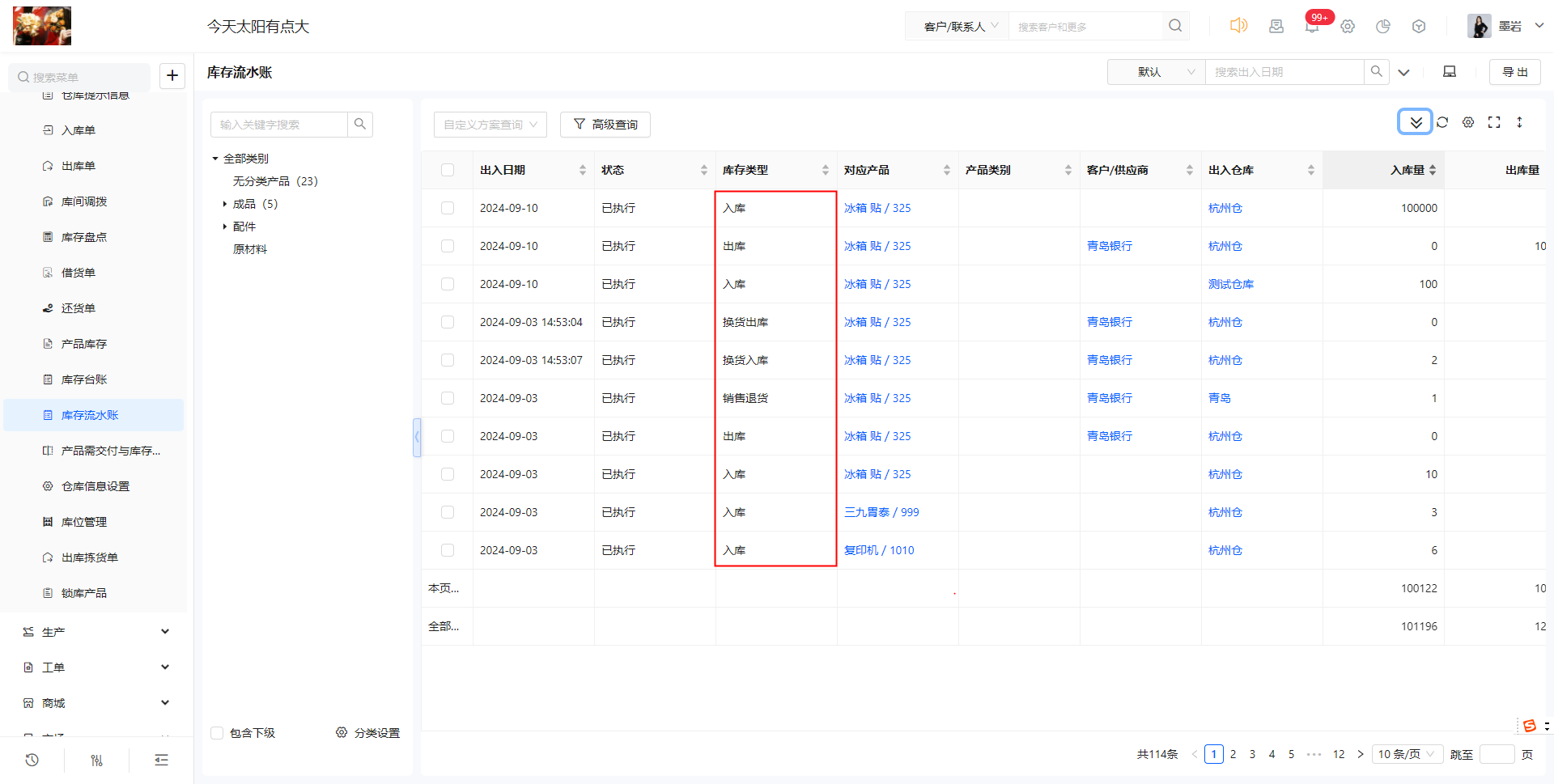 库存流水账:出入库类型的入库、出库细致拆分,便于筛选计算。