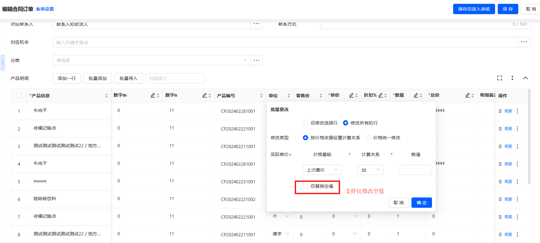 新建单据选择产品明细页面,批量修改功能,如果用户没有勾选过特定的产品行,则默认是全部,如果勾选过特定的行,再操作产品明细顶部的批量编辑,则默认选中:只修改选中行。用户可选切换。