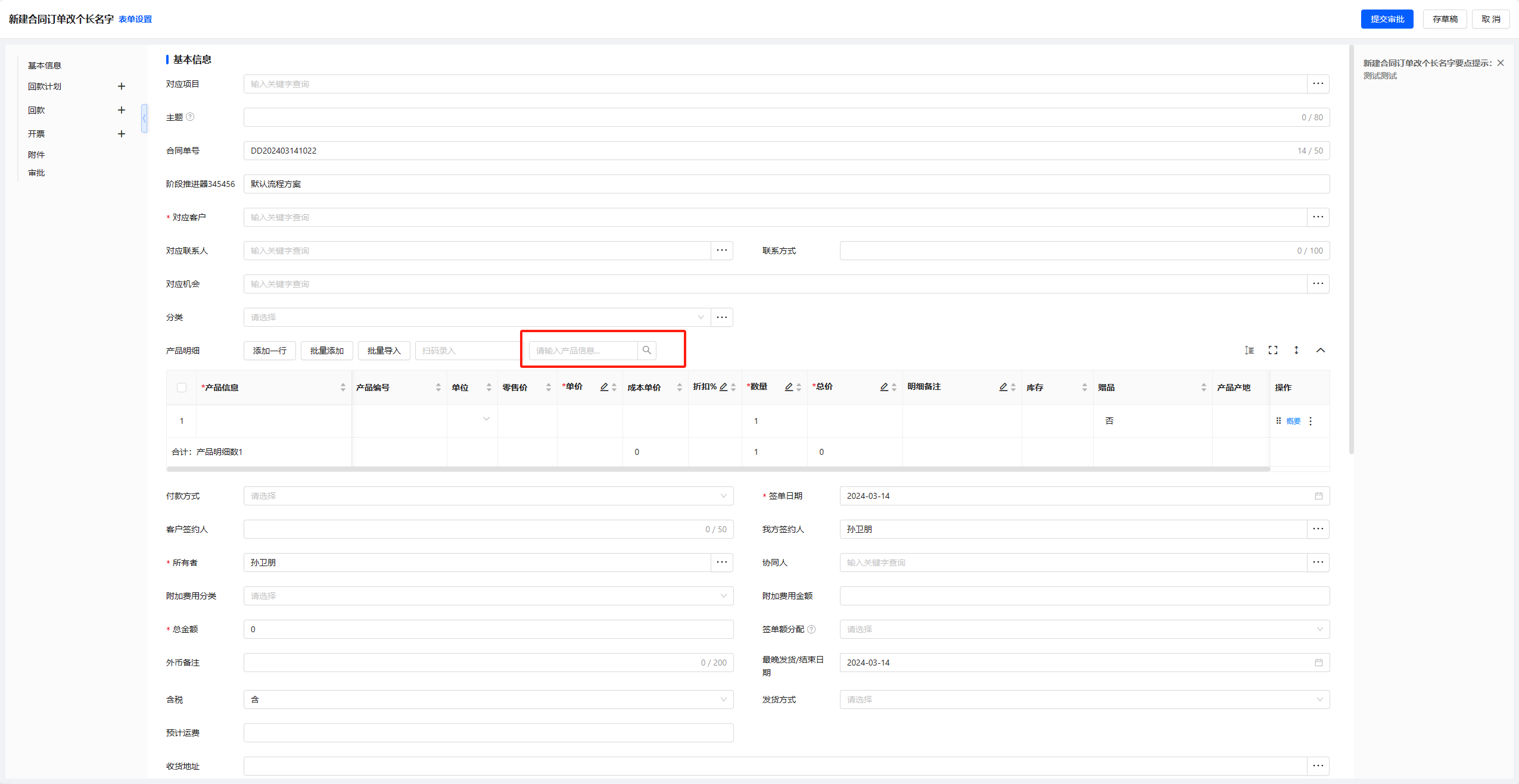 合同存在附加费用,形成合同总额与开票产品明细合计金额不符的,开票记录保存时给出提示,避免开票金额与合同需开票金额不一致,可修改开票产品明细金额,保持开票金额与合同总金额一致。