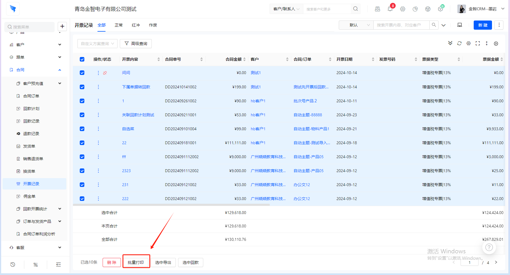 合同订单,采购订单,回款。付款。开票,增加批量打印功能