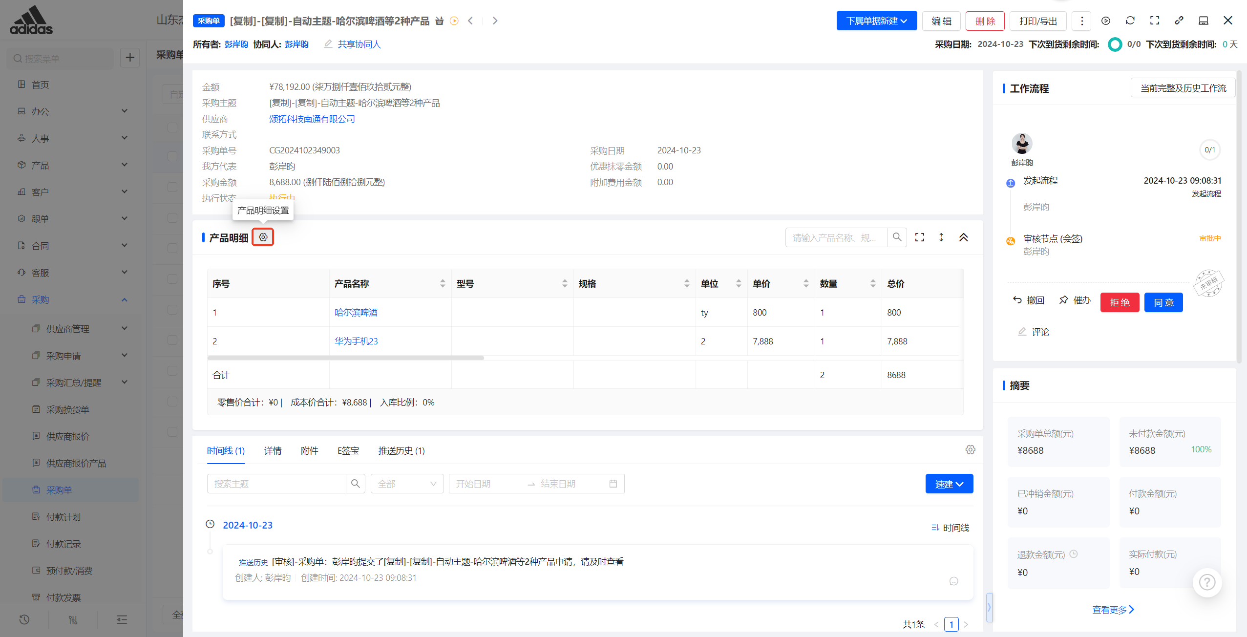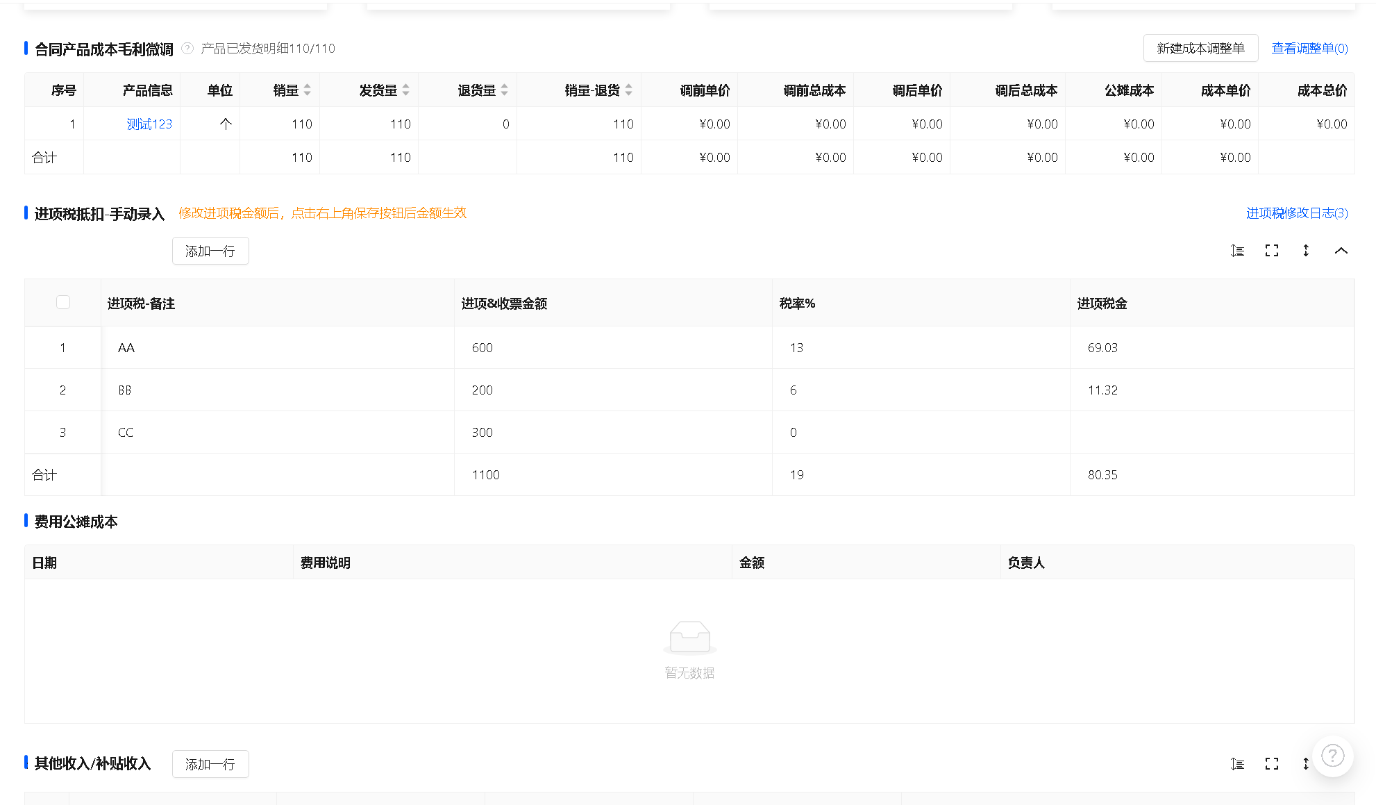 合同订单的成本微调,增加其他税金填写或者是采购单收票记录税金分摊的功能。方便记录提前采购备货的产品,税金成本分摊到合同的情况