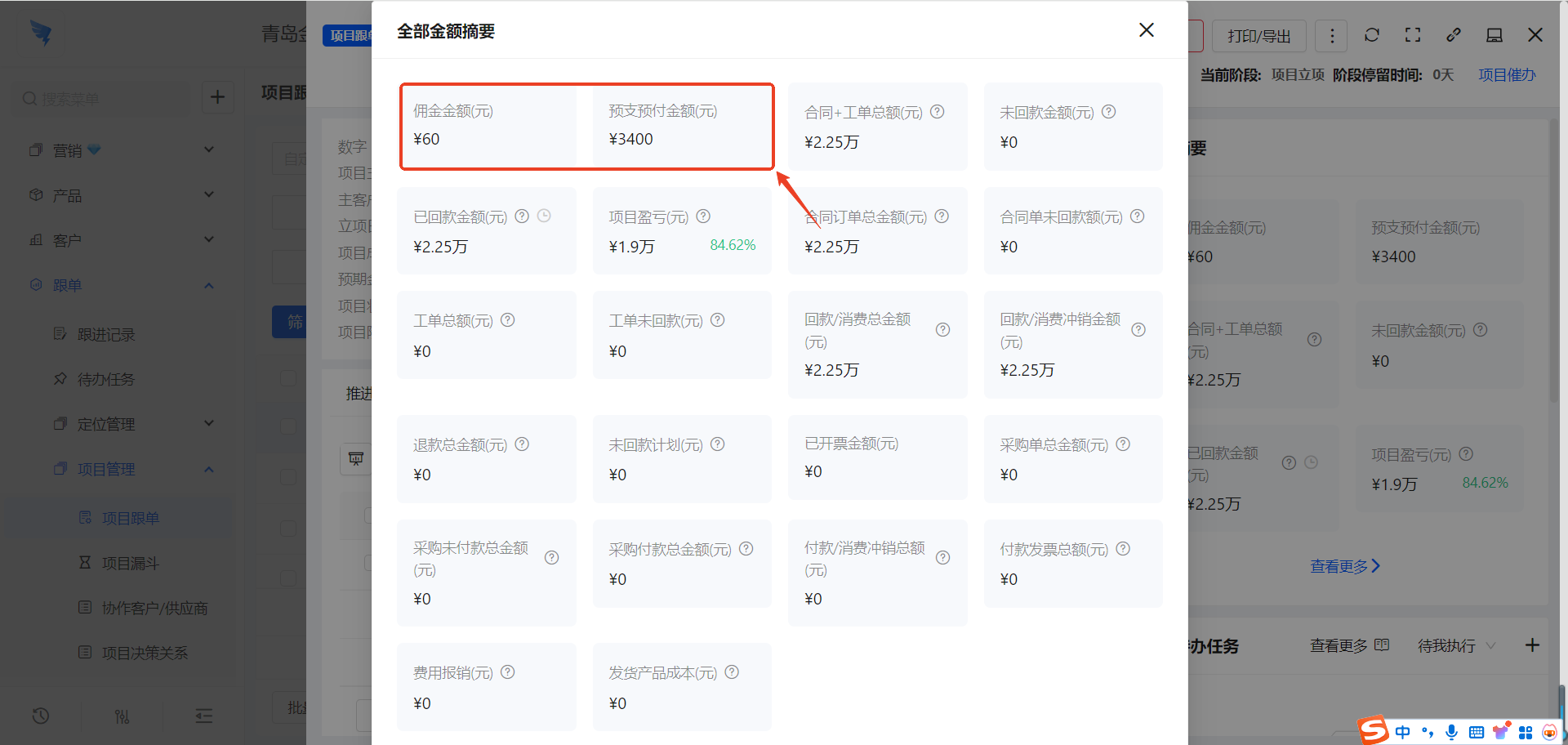 项目视图中的项目盈亏计算方式增加佣金金额、预支预付金额参与计算。