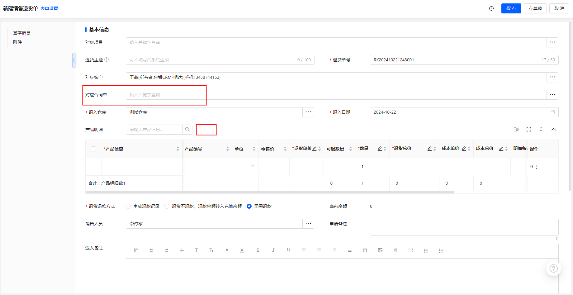 销售退货单,关联客户且未关联合同订单时,允许手动添加产品明细。 关联客户且关联合同订单时,只读取关联合同订单中的产品明细,不允许手动修改。