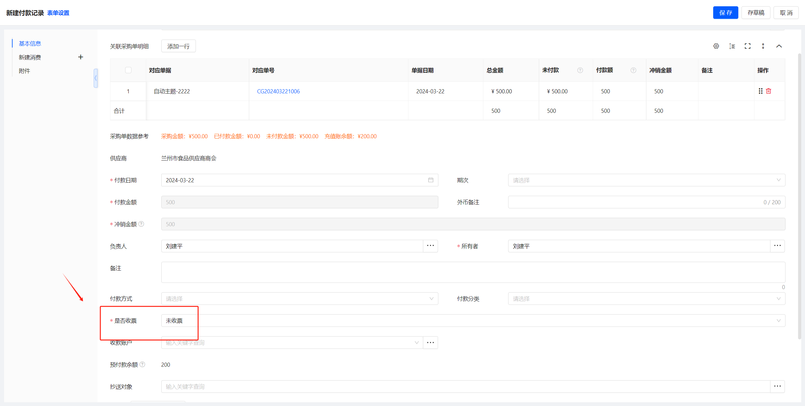 (2)如果是含税采购,速建付款记录,此时并无发票产生,默认是未开票状态,可选切换为已收票,如果保存时,无对应开票记录,将自动变回未收票。
