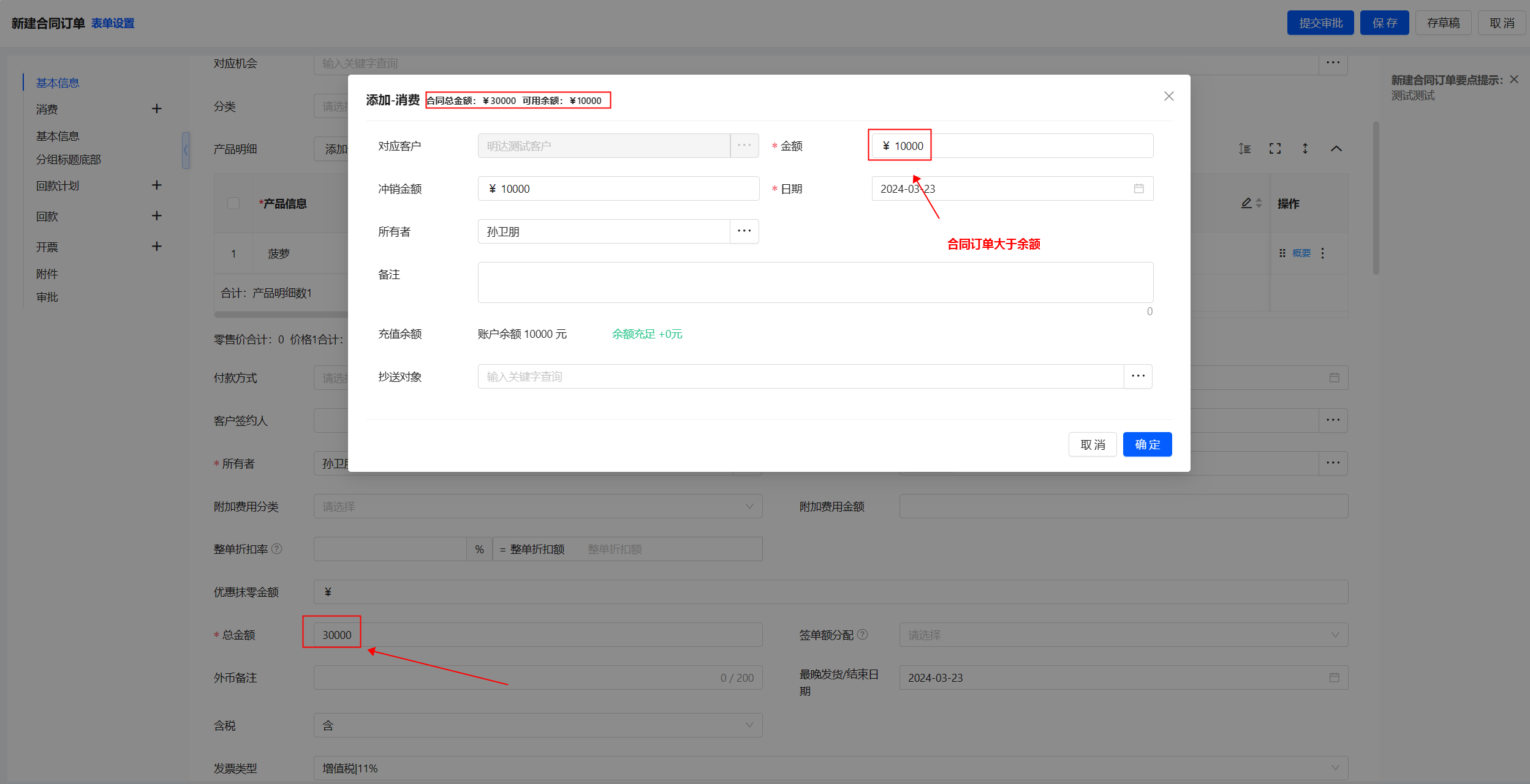 客户有预充值余款,新建合同页面,左上角速建单据:消费,新建页面,如果预充值余额大于合同金额,自动提取合同金额作为消费金额,如果预充值余额小于合同金额的,提取预充值余额,默认不再需要手工输入消费金额,可选修改输入金额。