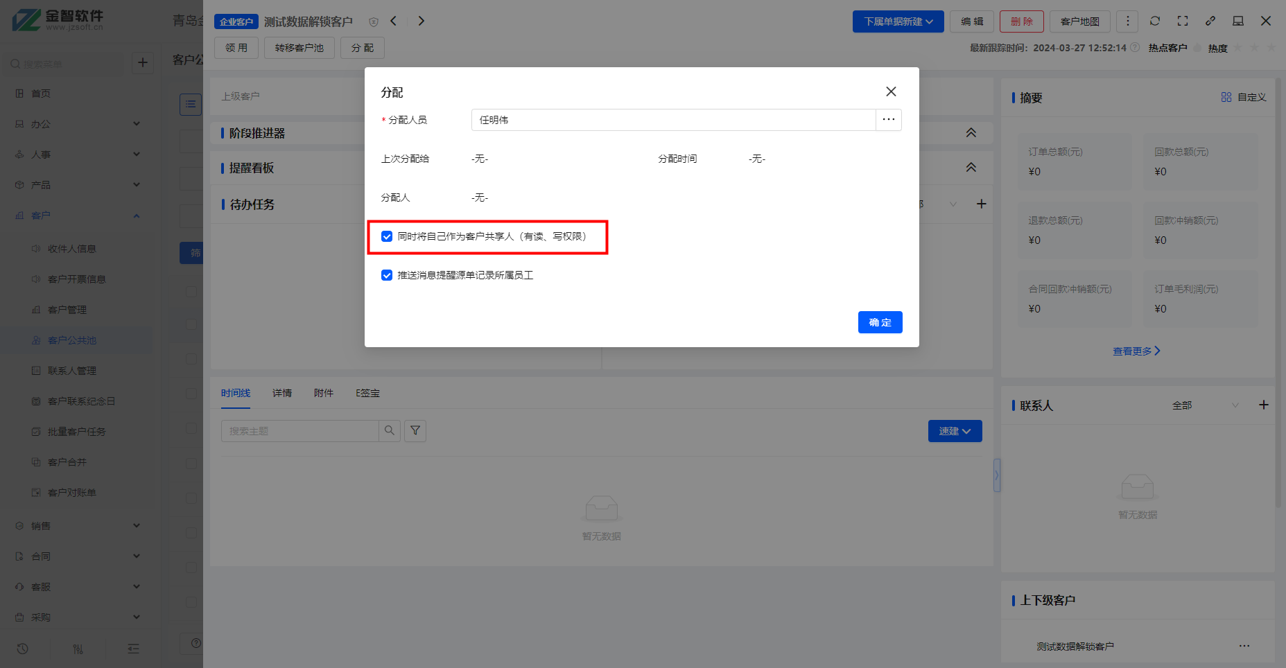 客户公海池-客户视图,分配客户给其他员工,可选是否将自己快捷设置为“共享读人员、共享写人员”。
