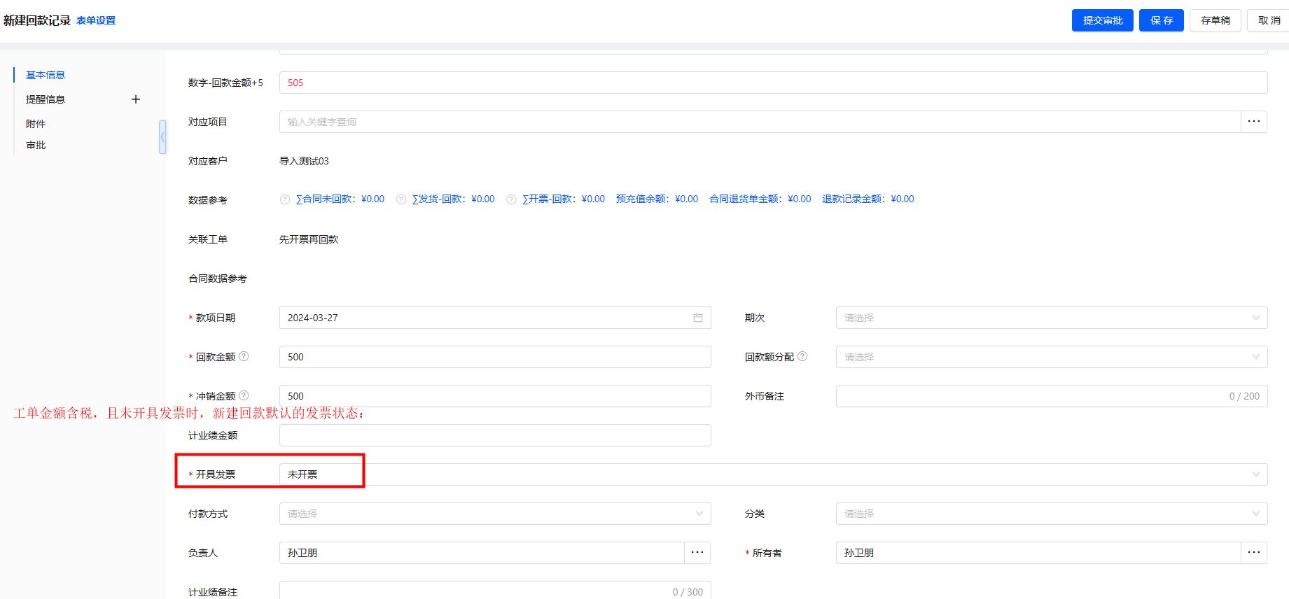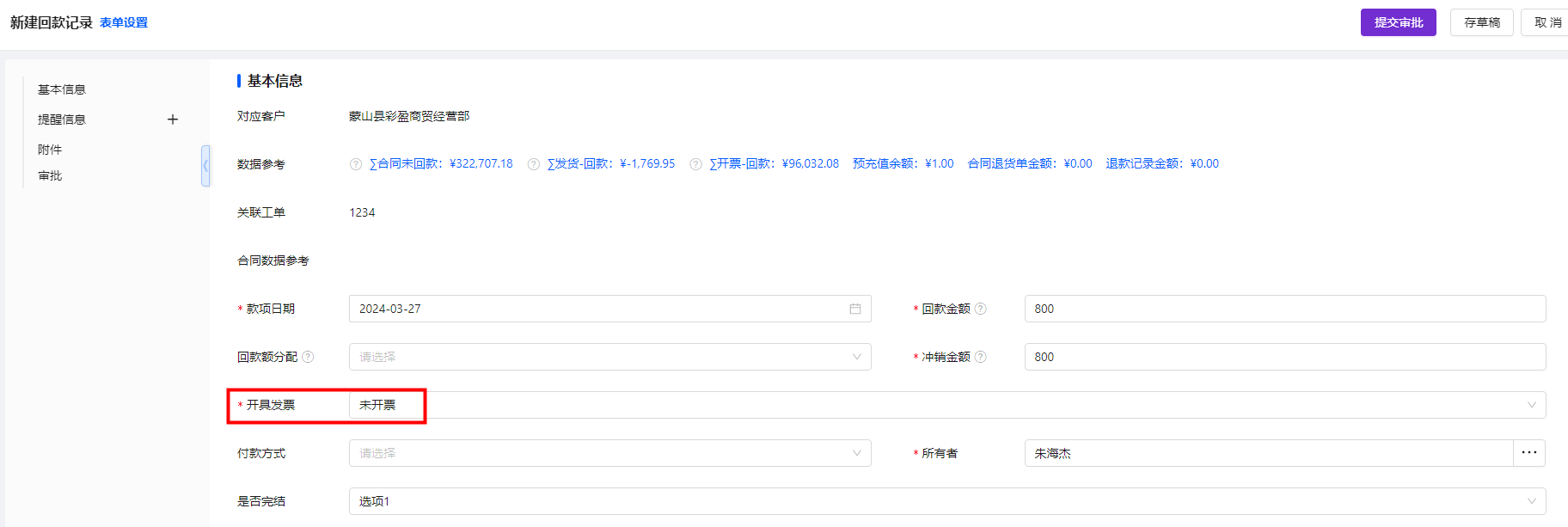 (2)若新建回款记录时无开票记录,标记为未开票,后续产生开票记录关联合同的,合同回款金额、开票金额完毕后,自动将回款的开票状态标记为已开票,无需人工修改。