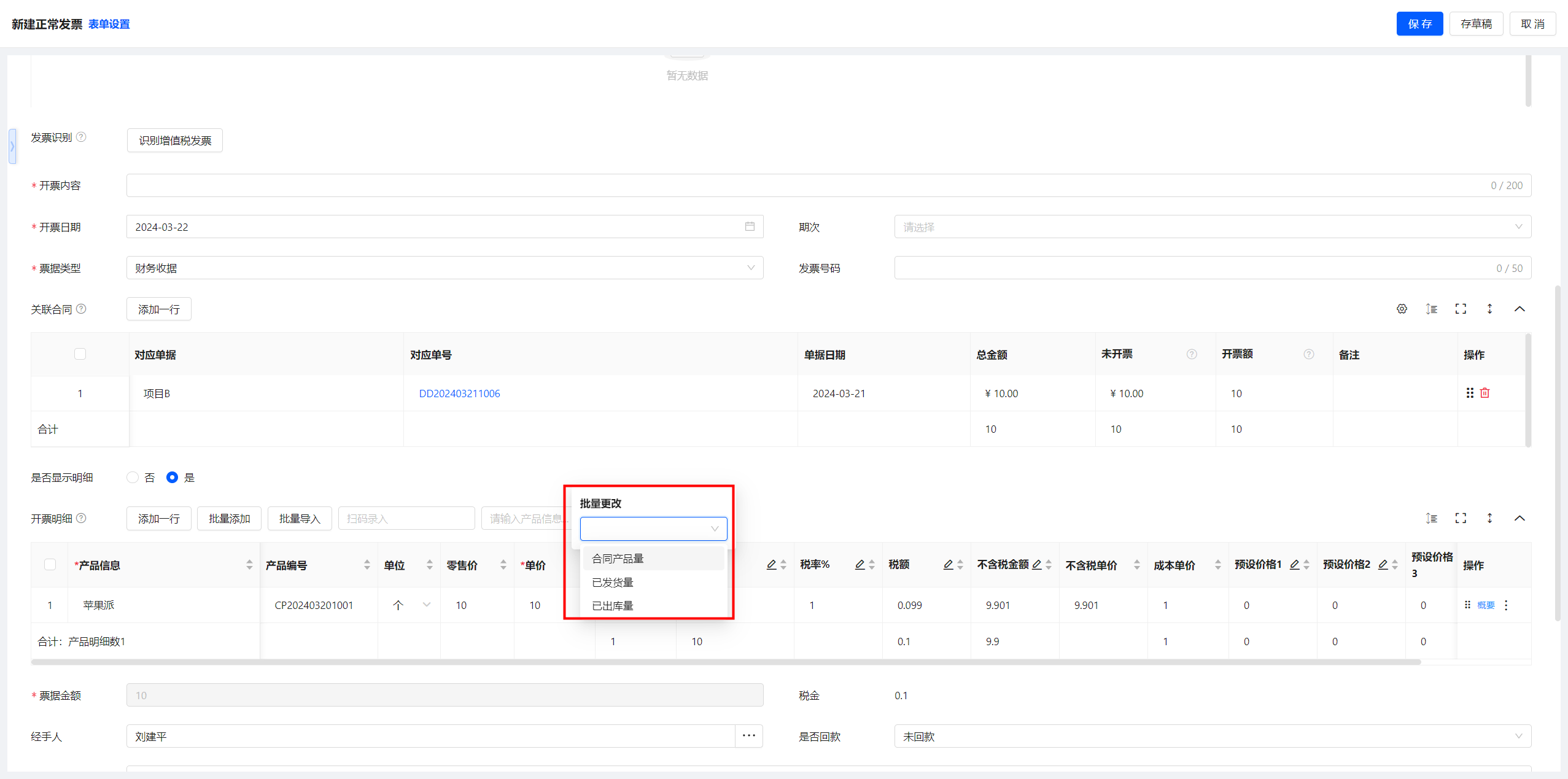 默认合同开票,开票产品明细数量,提取合同产品数量,用户可选修改批量提取已出库数量、已发货数量,提取后可以选择修改,用于按出库量开票、按发货量开票的快捷操作。