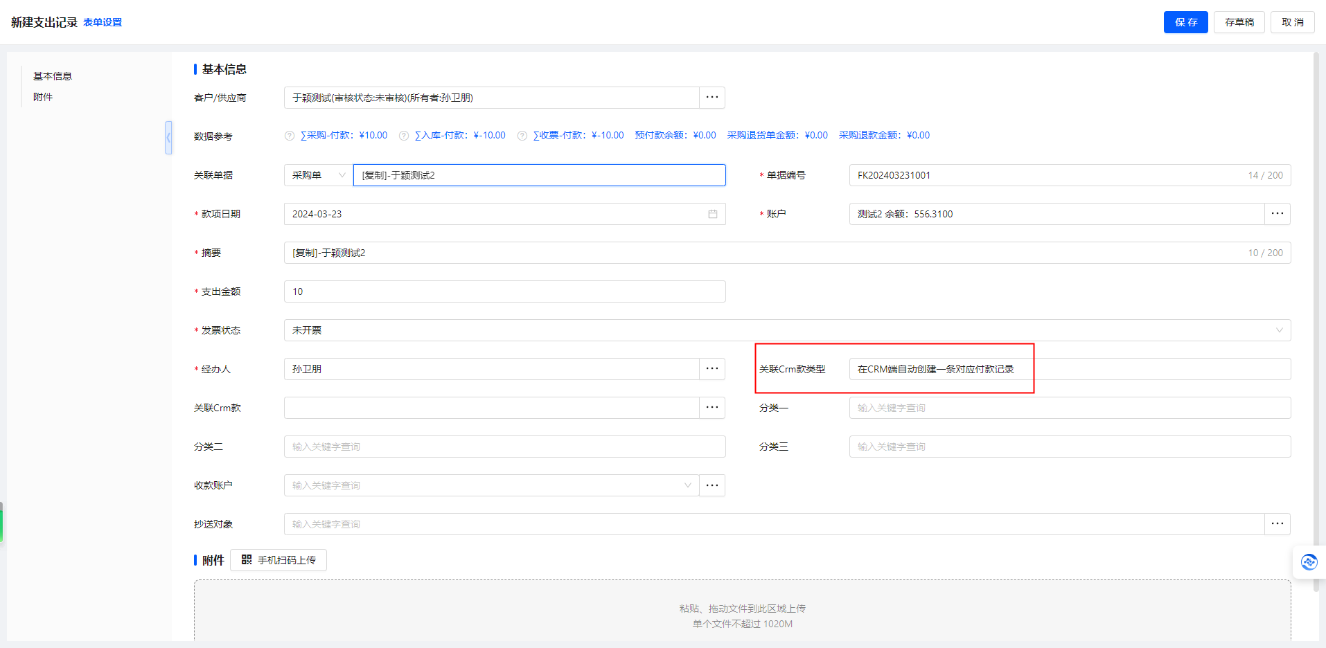 (2)新建支出关联供应商,关联采购单,如果采购单不存在下属付款记录,收入页面关联CRM款项类型默认为:在CRM端自动创建一条付款记录,用户可选修改。