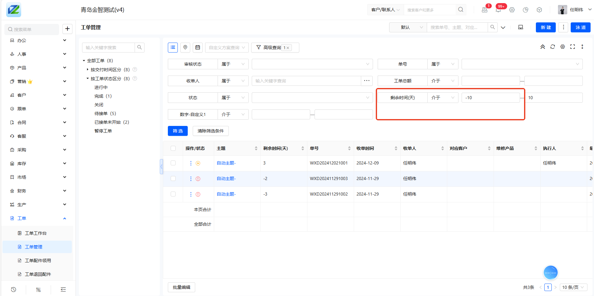 7.1 工单列表和高级查询增加“剩余时间(天)”列,提取交付时间与今天的间隔天数。