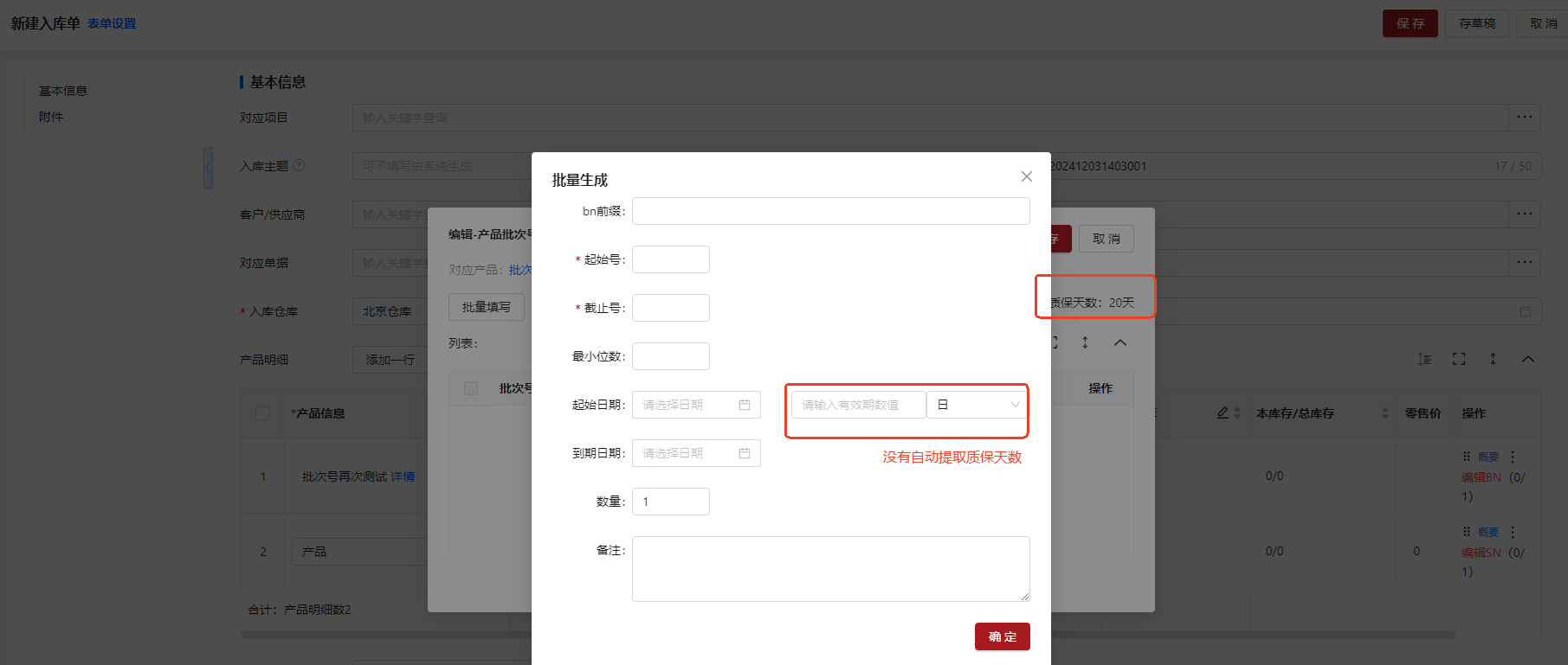 2.4 产品信息里如果填写了质保天数,入库新建批次号/序列号时到期时间会自动计算 ,并支持手动修改日期 。