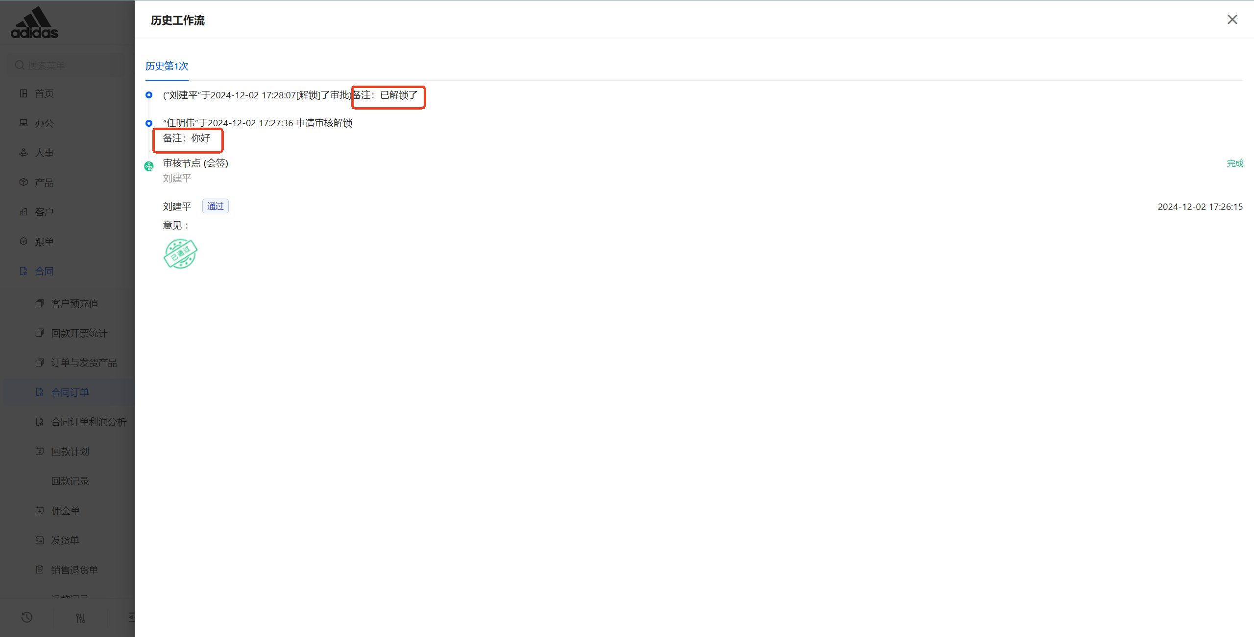 8.1 单据如果有过审核解锁,历史工作流里显示申请解锁的原因和确认解锁时候的备注。