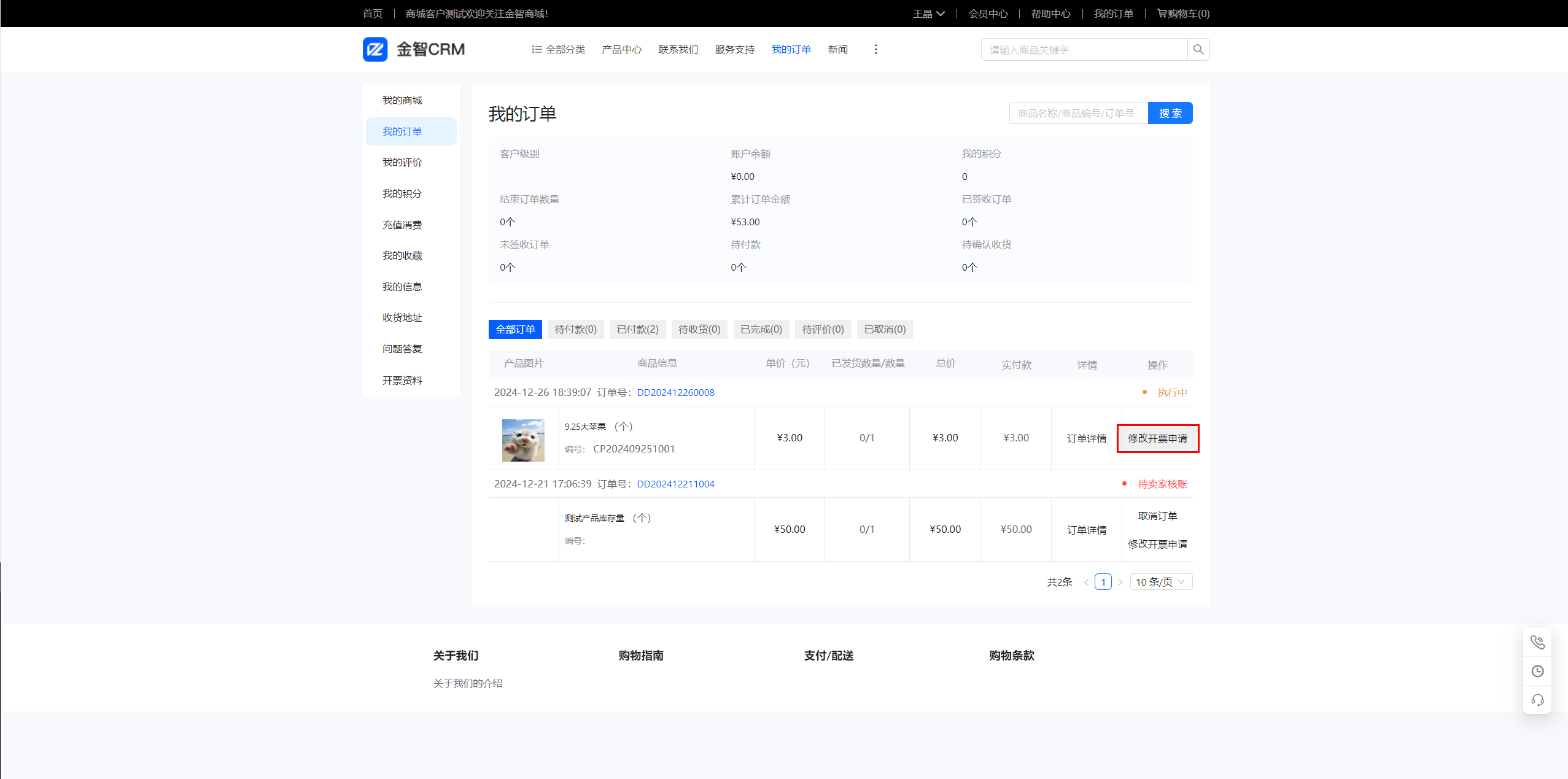 商城端支持修改开票申请,未开票以前可以修改开票申请资料。
