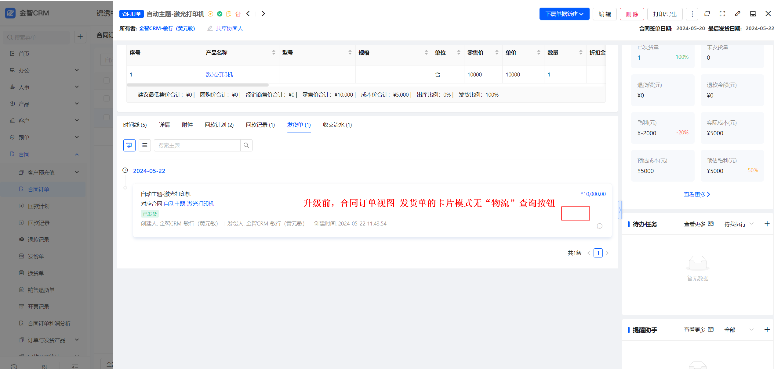 合同订单时间线卡片中,增加“物流”查询按钮。