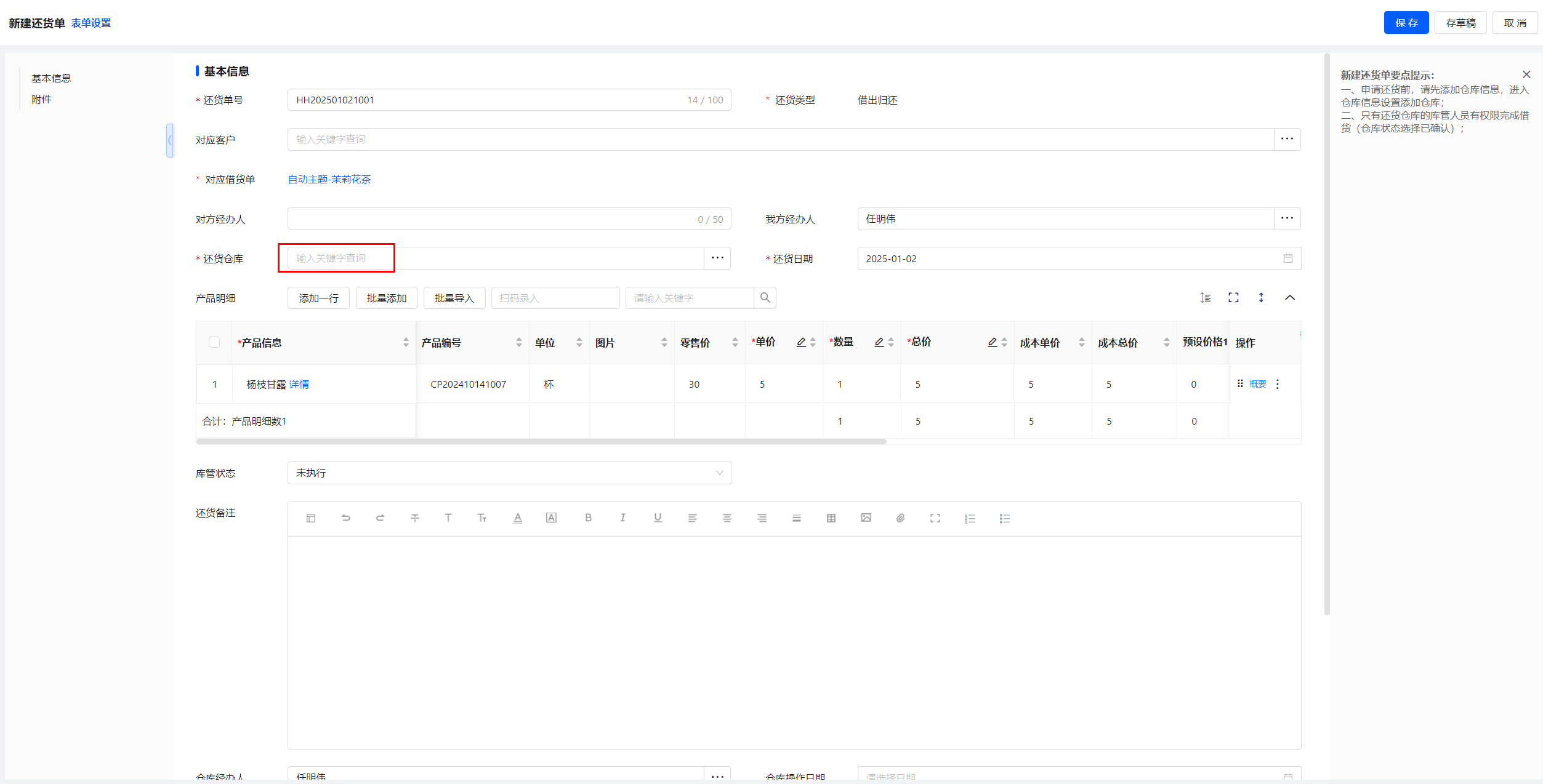 6.1 借货单,转还货单,对应仓库支持自动对应借货仓库,支持可手动选择其他仓库。