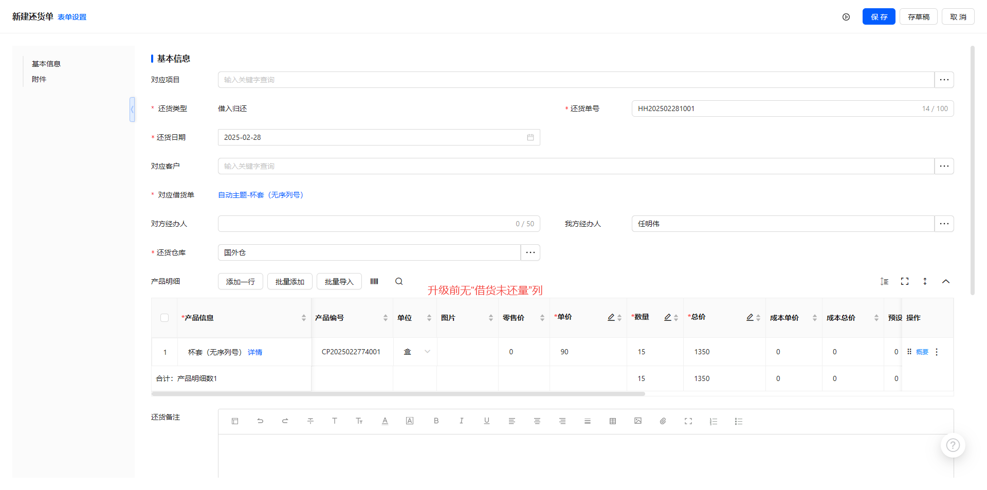 5.1 新建/编辑还货单时,产品明细中增加“借货未还量”列。