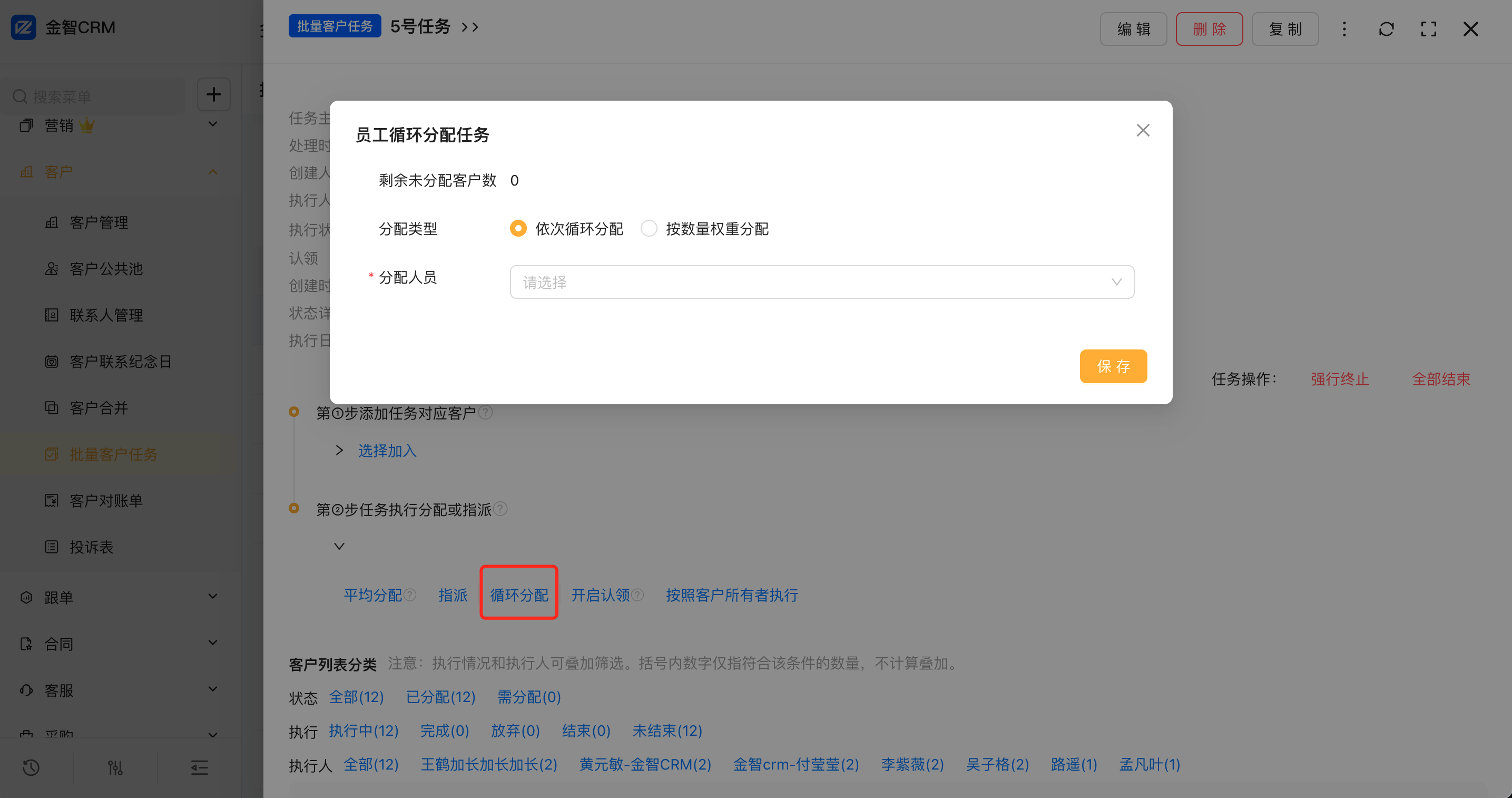 3.1 客户-批量客户任务,任务视图操作步骤中增加了循环分配模式,可按需选择一次循环分配或者按数量权重分配。