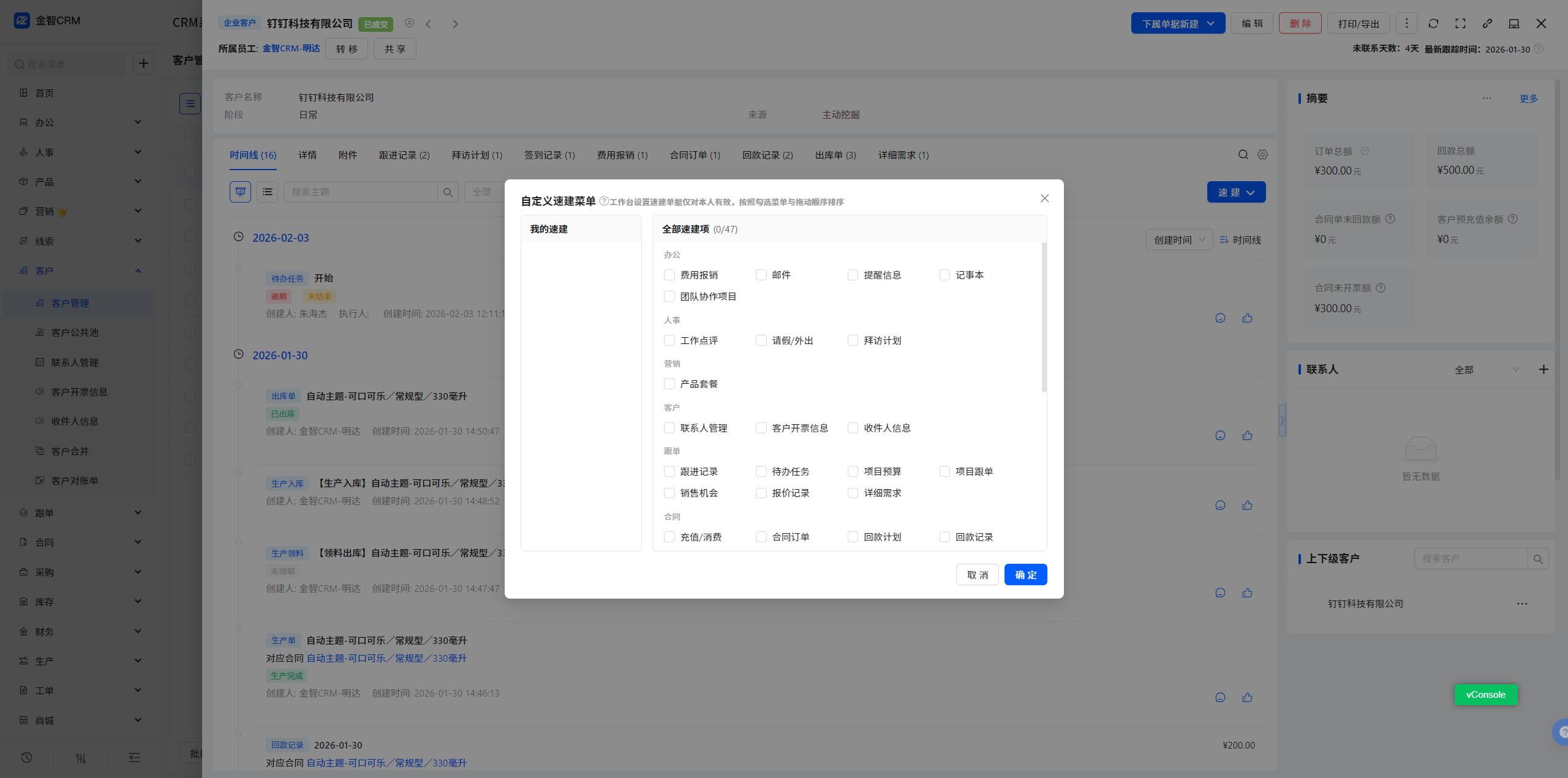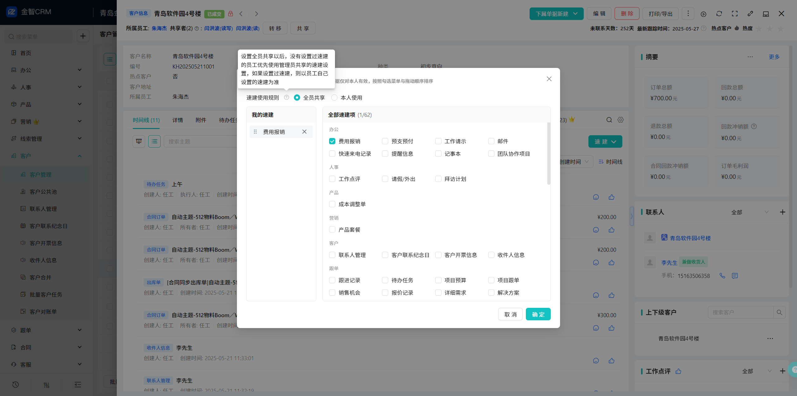 5.2 客户管理-客户视图-时间线-速建自定义-新增速建使用规则:设置全员共享以后,没有设置过速建的员工优先使用管理员共享的速建设置,如果设置过速建,则以员工自己设置的速建为准