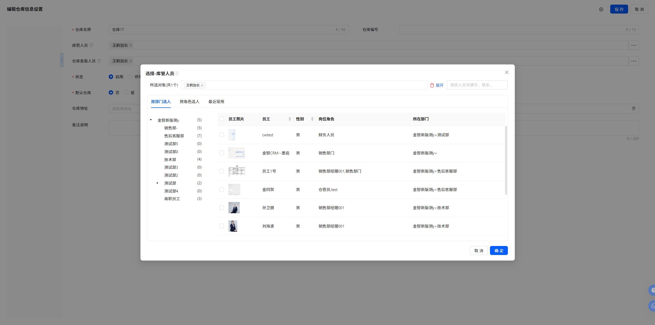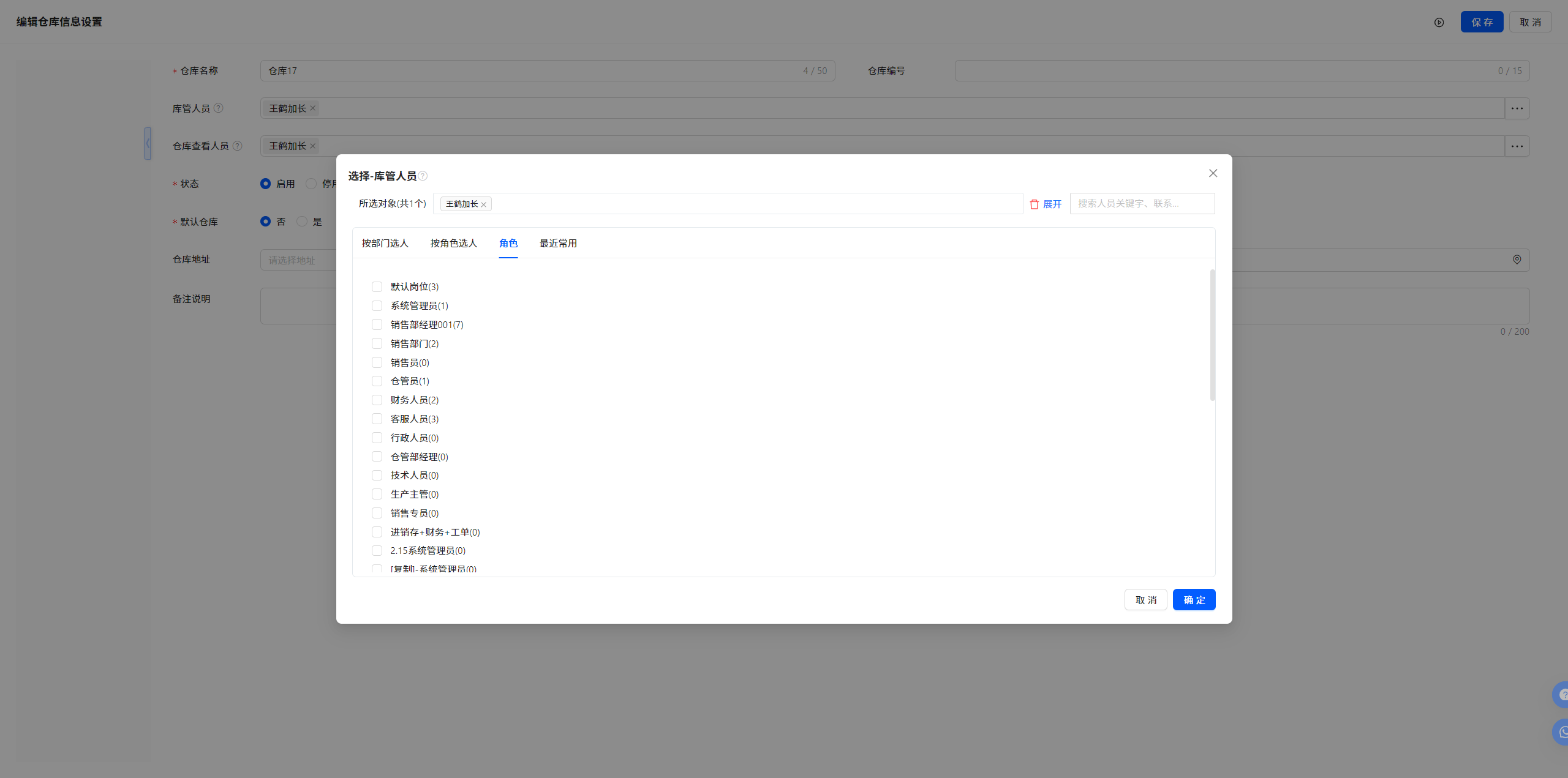 4.1 仓库信息设置-仓库新建/编辑-库管人员-增加按角色设置