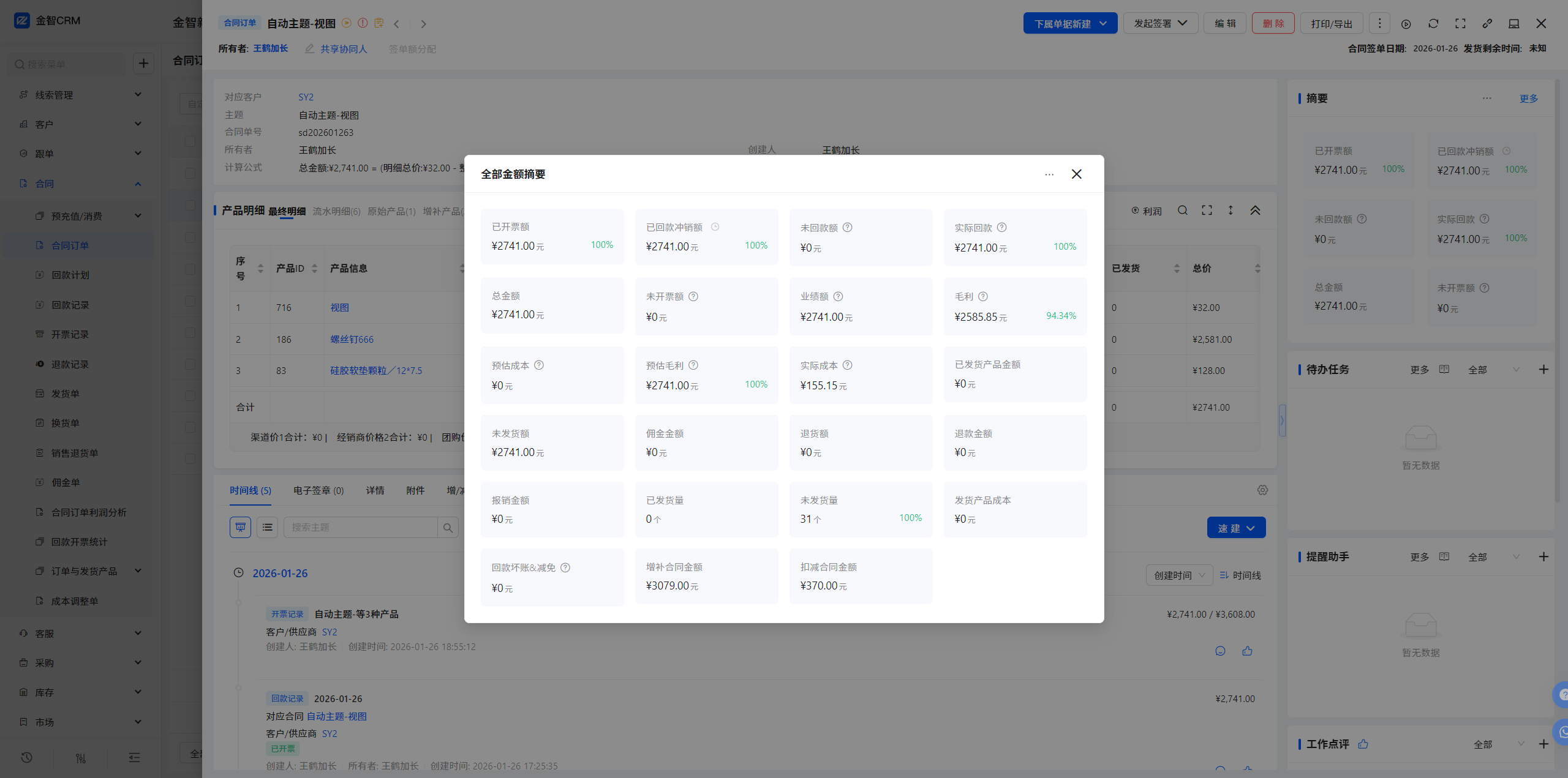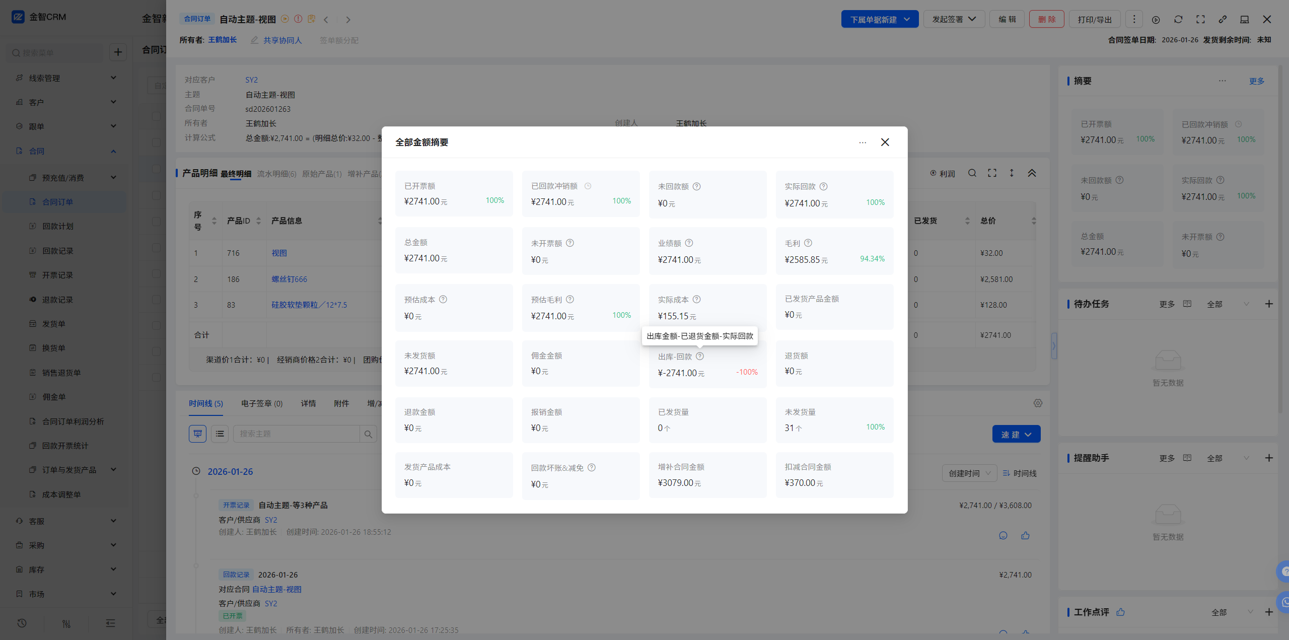 3.2 合同订单-单据视图-摘要-新增摘要数据-(出库-回款):出库金额-已退货金额-实际回款