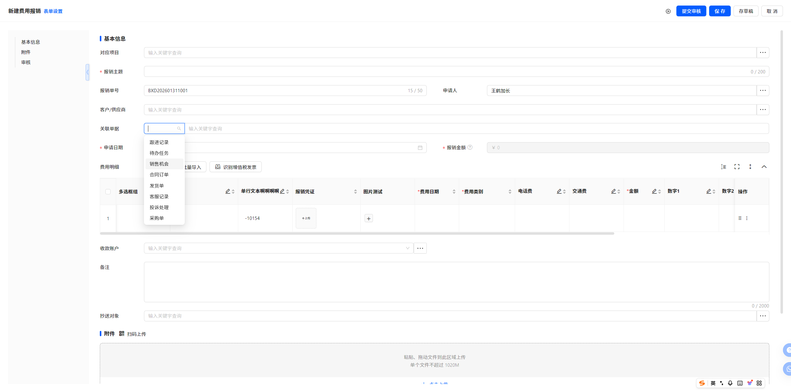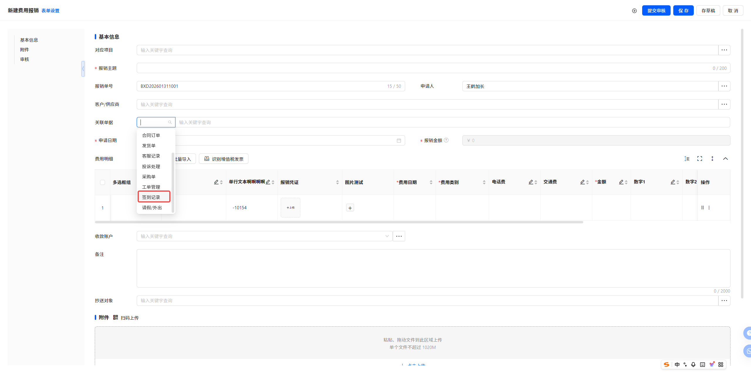 1.1 费用报销-单据新建/编辑-关联单据类型新增-签到记录