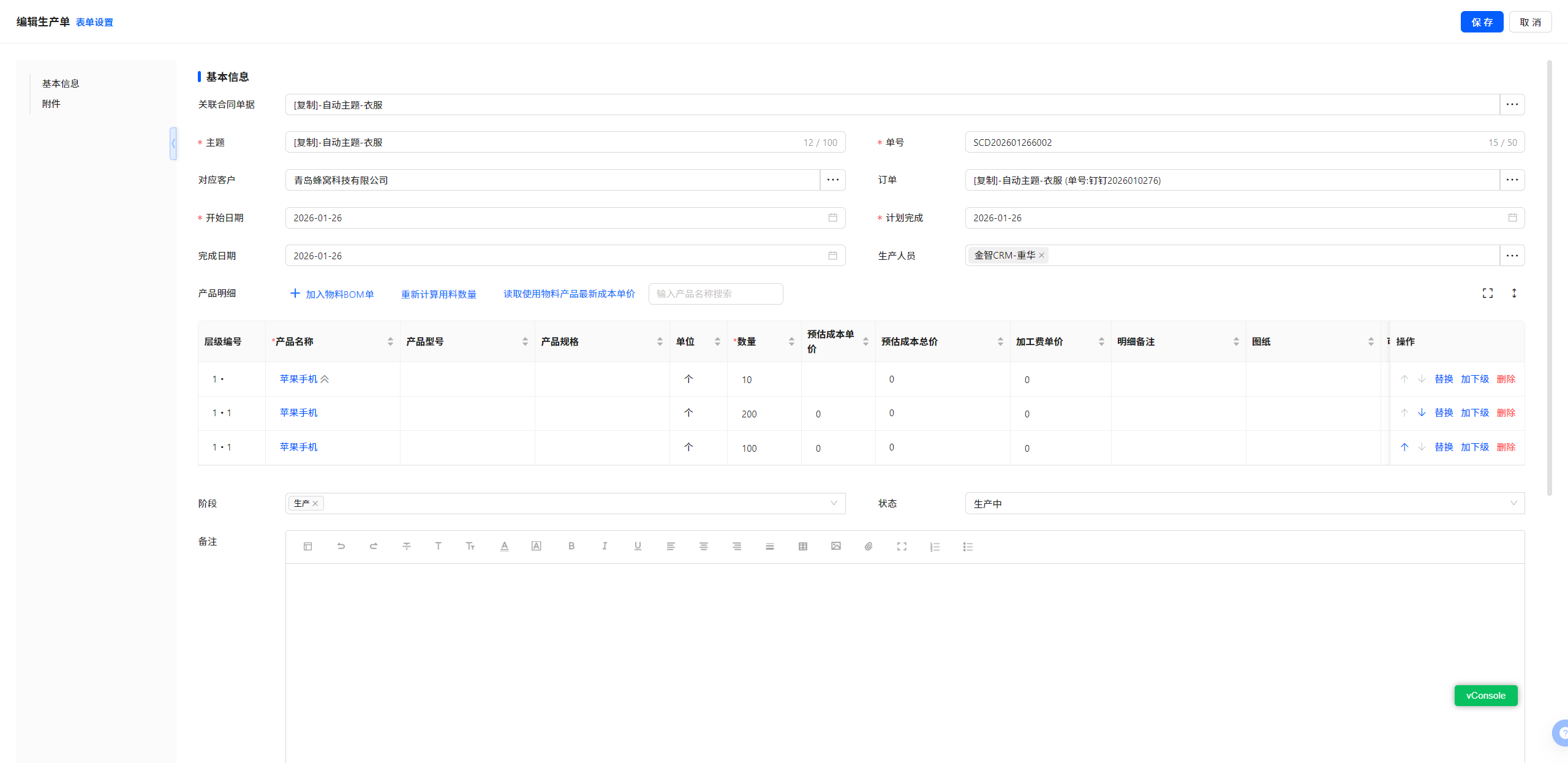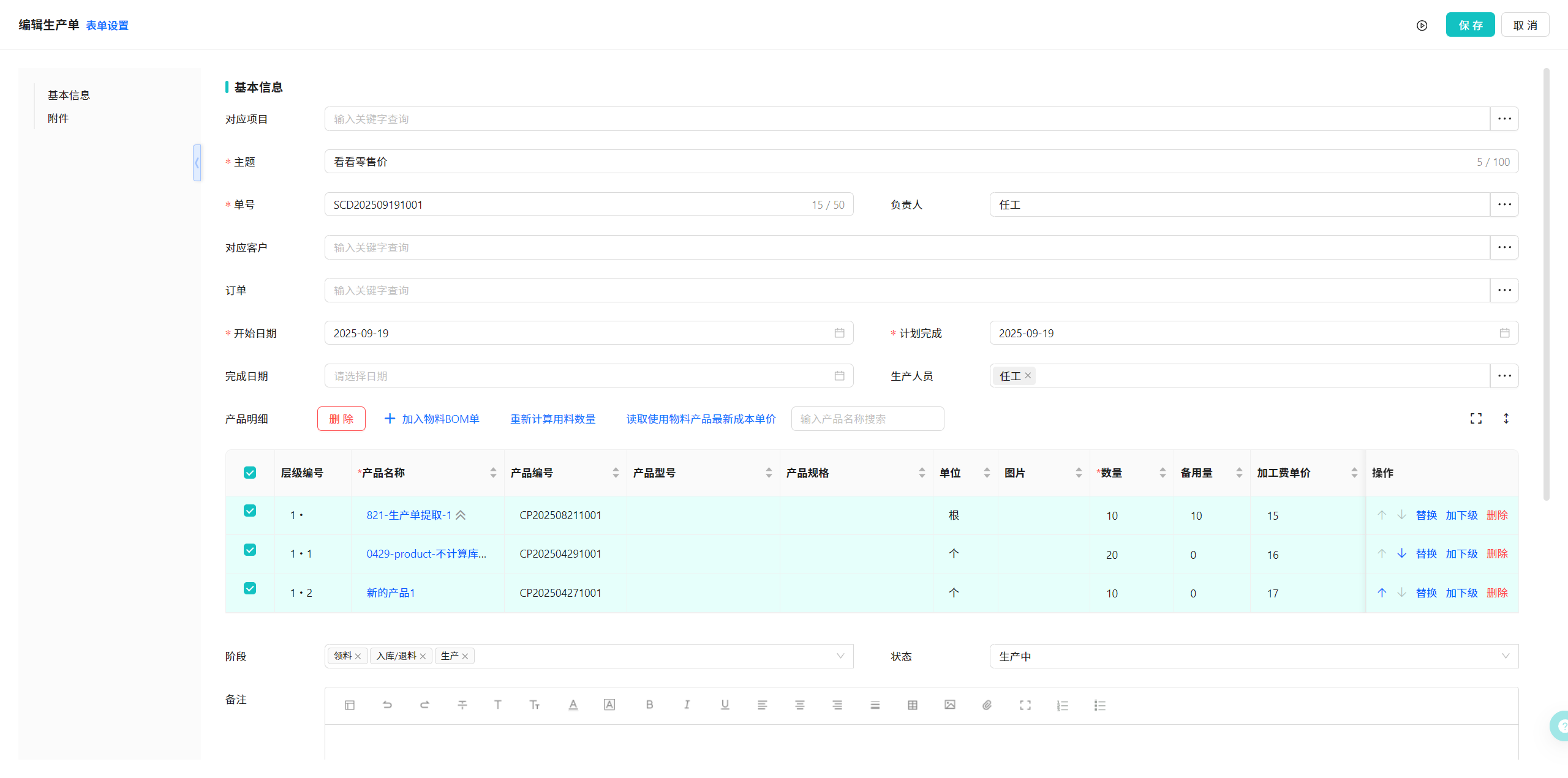 10.1 生产单-单据新建/编辑-产品明细-增加明细多选删除按钮